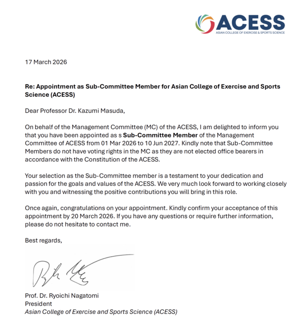 アジアスポーツ科学学会(ACESS)の委員会委員の委嘱を受けました。