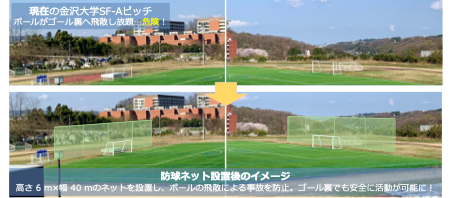なお、金沢大学では「金沢大学スポーツ・地域活性化ドリームプロジェクト」の下、民間資本を活用した施設整備が行われ、平成30年に国立大学では珍しく複数面の人工芝ピッチや照明設備、クラブハウスが完成しました。令和4年春には防球ネットを設置して、より安全で快適なピッチ環境になりました。