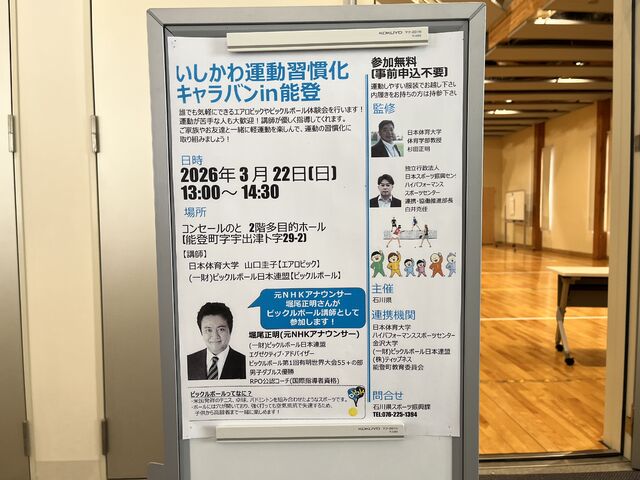 いしかわ運動習慣化キャラバン in 輪島&能登町... いしかわキャラバンで再び訪問。本事業での能登訪問は10回を数えました。両日、ダンスプログラムで身体をほぐし、体力測定を実施した後、ピックルボールで汗を流しました。プレー中の心拍数から運動強度もチェック。パドルテニス連盟(会員)の方々も合流し、かなりアクティブな体験会となりました。2日目には堀尾正明氏(元NHKアナ、ピックルボール連盟エグゼクティブアドバイザー)が合流し、参加者へ熱い指導をされていました。充実した2日間でした。また年度が明けたら訪問です。
